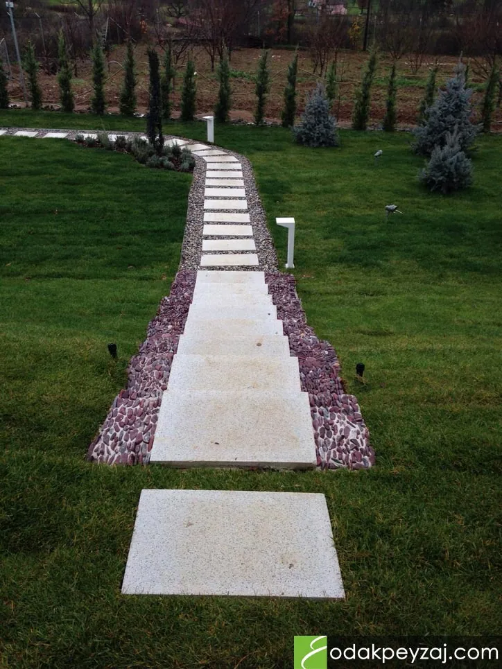 Odak Peyzaj, projenizde doğal taş (granit, bazalt), ahşap görünümlü kompozit malzemeler, beton plakalar veya dekoratif çakıl gibi çok çeşitli bahçe zemin döşeme çeşitleri arasından en uygun olanını teknik detaylarıyla sunar ve uygular.